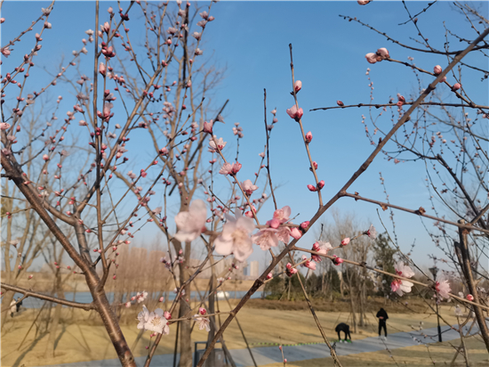 下午3點,陽光透著溫暖,許多市民在草地上或躺或坐,孩子們手里牽著風箏,嬉笑追逐,幾株桃花被早春的氣息撞了一下,羞赧地開著,垂柳露著嫩綠的芽兒,在風中舞動。