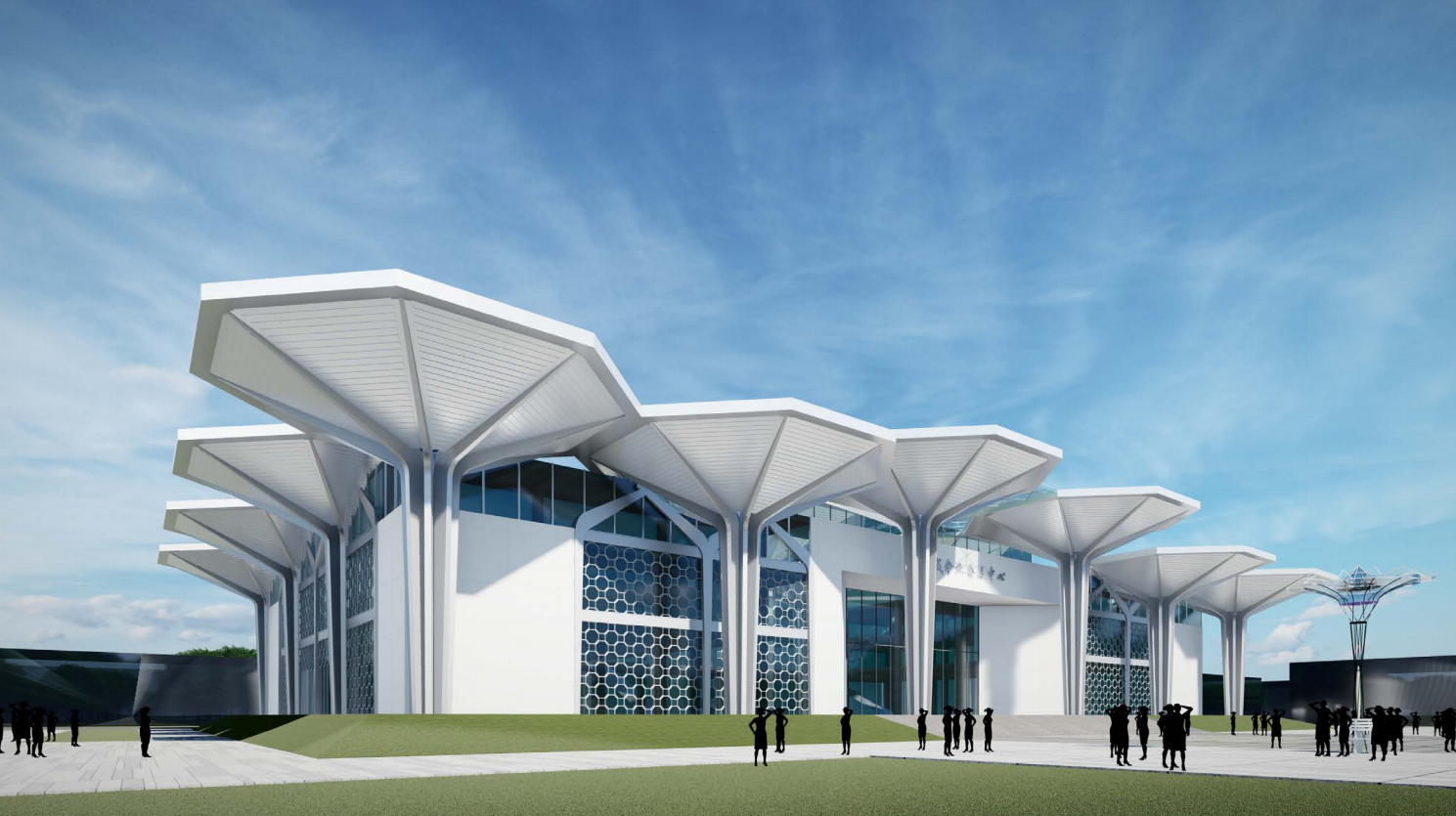 鄲城縣傘業(yè)產(chǎn)業(yè)園電子商務(wù)服務(wù)中心項(xiàng)目是鄲城縣傘業(yè)全產(chǎn)業(yè)鏈展銷的窗口項(xiàng)目、展示項(xiàng)目。會(huì)展中心的設(shè)計(jì)概念以“傘啟鄲興”為主題,基于對(duì)本土特色文化的深入解讀、同時(shí)結(jié)合“傘”的具體特征,提煉傘蓋、傘骨、傘柄的特殊形象為基本元素。建筑主立面以八個(gè)巨大傘形構(gòu)架依次展開,巨型的尺度、新穎的造型有極強(qiáng)的昭示性,裝飾幕墻八邊形的單元分割也隱喻了傘蓋的造型,創(chuàng)新的視覺形象為傘業(yè)產(chǎn)業(yè)園增加了新的注解。會(huì)展中心整體的建筑風(fēng)格充分展示了鄲城傘業(yè)產(chǎn)業(yè)園的核心價(jià)值,形成獨(dú)具特色的地標(biāo)形象。