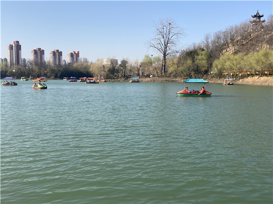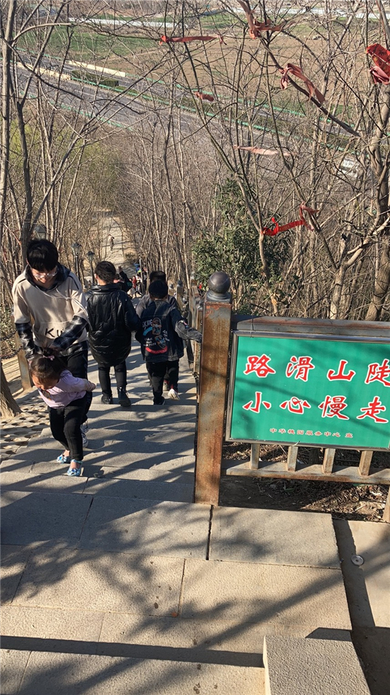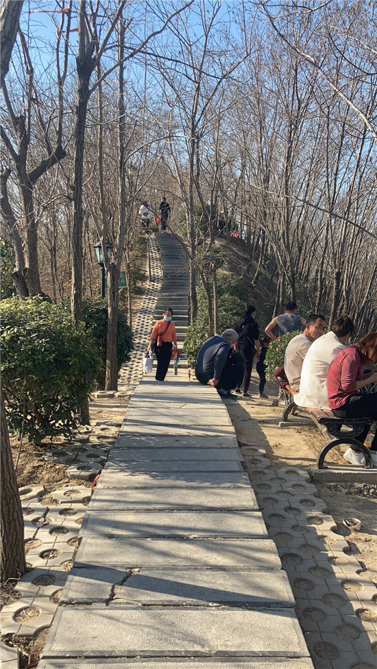 在槐香湖邊,年輕人三五結(jié)伴登上游艇,“坐船能到湖那邊的小島,島上也有槐樹,拍照肯定特別漂亮。”返鄉(xiāng)大學生把七星島上的景色留在了自己的相機里。七星島與槐香湖相連的橋上,人潮擁擠,有的人席地而坐,觀賞著橋上的風景。當問道在外市工作的王先生游玩感受時,他回答到:“年后上班沒時間鍛煉身體,今天我把全家人帶來登山,呼吸一下新鮮空氣?!雹?