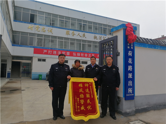 2月27日上午,一名群眾將寫著“神速解民憂 雄風(fēng)揚警威”錦旗送到川匯公安分局荷花路派出所民警手中,感謝民警們的辛苦付出。錦旗背后的故事還得從一條抖音說起。