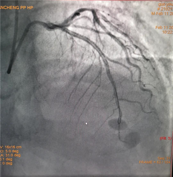 除夕,郭先生無(wú)明顯誘因突發(fā)胸痛,120急救人員到達(dá)現(xiàn)場(chǎng),心電圖顯示:竇性心律完全性束支傳導(dǎo)阻滯。信息立刻發(fā)送到胸痛中心介入微信群中,心內(nèi)科值班醫(yī)生初步診斷為急性廣泛前壁心肌梗死,必須盡快進(jìn)行急診支架治療,開(kāi)通血管。值班醫(yī)生電話指導(dǎo)院前治療,并立即啟動(dòng)胸痛綠色通道,24小時(shí)備班的介入治療團(tuán)隊(duì)立即到位,9:30患者被送到導(dǎo)管室行冠脈介入診療,9:40急診PCI手術(shù)隨之開(kāi)始,冠脈造影檢查提示左前降支閉塞,植入支架,堵塞的血管被順利打通,患者癥狀緩解,手術(shù)非常成功,10:20患者被送往病房進(jìn)一步治療。