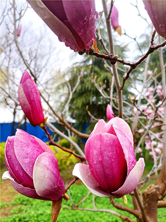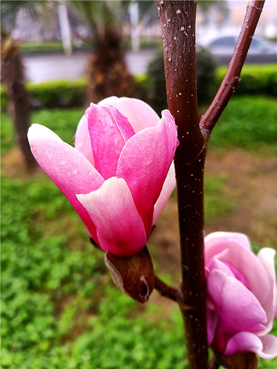 “霓裳片片晚妝新,束素亭亭玉殿春。已向丹霞生淺暈,故將清露作芳?jí)m?!?月11日,我市下了一場(chǎng)小雨,路旁的紫玉蘭更顯晶瑩玉潤(rùn),朵朵玉蘭花如雨后新荷般清麗脫俗,或含苞待放、欲語(yǔ)還休,或花瓣盡展、舞姿翩翩,令人不禁駐足欣賞。