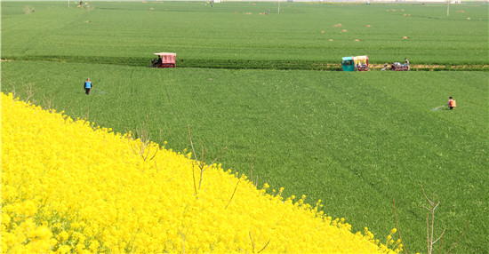 3月24日,河南省商水縣郝崗鎮(zhèn)北社村村民在管理麥田。春分到來,天氣變暖,鮮花盛開,素有“豫東糧倉”之稱的商水縣進(jìn)入春耕備耕忙碌時節(jié),村民紛紛走向田野,伴著花香開展春季農(nóng)業(yè)生產(chǎn),田間地頭一片熱火朝天的繁忙景象。②7