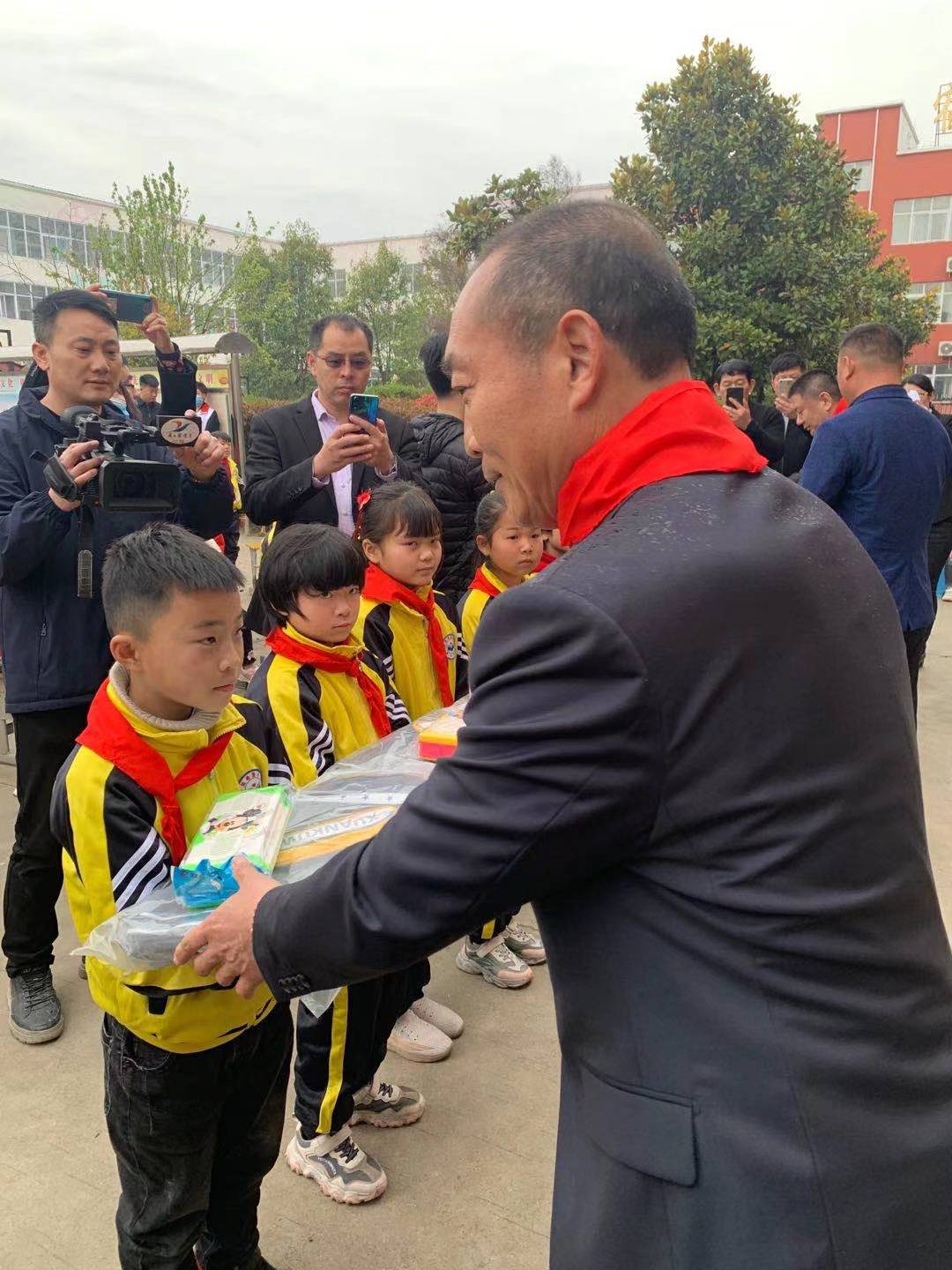 在《愛(ài)的奉獻(xiàn)》音樂(lè)聲中,出席活動(dòng)的有關(guān)領(lǐng)導(dǎo)為30名學(xué)生發(fā)放書(shū)包、文具和慰問(wèn)金。