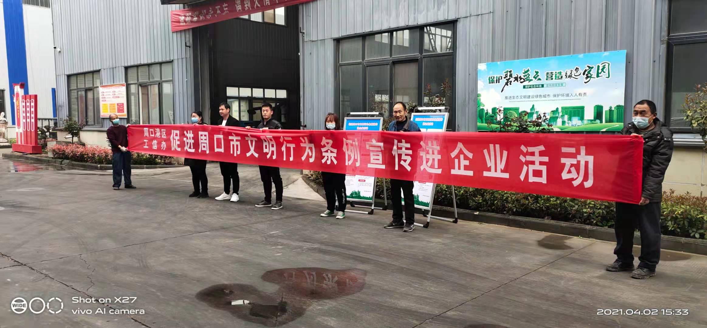 為迅速掀起學習宣傳《文明行為促進條例》熱潮,不斷提升廣大企業(yè)員工文明法治意識、社會責任意識,運用法律法規(guī)規(guī)范促進文明行為,4月2日下午,周口港區(qū)工信辦組織人員開展宣傳《周口市文明行為促進條例》進企業(yè)的活動。