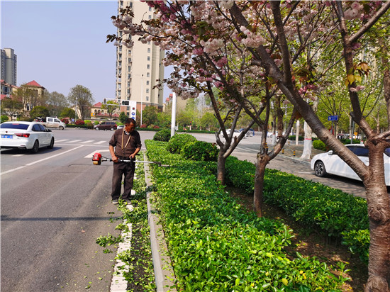 圖為城鄉(xiāng)一體化示范區(qū)的園藝工人正在修剪周口大道邊的綠植。
