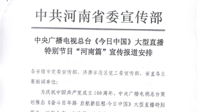 中央廣播電視總臺《今日中國》大型直播特別節(jié)目“河南篇”宣傳報道安排