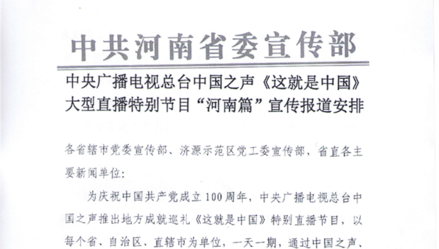 中央廣播電視總臺中國之聲《這就是中國》大型直播特別節(jié)目“河南篇”宣傳報道安排