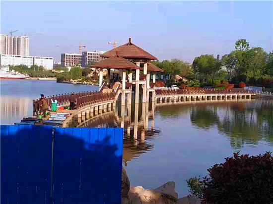 近日,位于文昌大道的周口公園啟動了對水上棧道的維修。周口公園的水上棧道和亭榭是一道美麗的風(fēng)景,成為人們游園打卡之地,然而因建造時用的是木材,歷經(jīng)風(fēng)雨,朽壞嚴重,存在安全隱患,周口公園方面于去年將之封閉。記者在現(xiàn)場看到,工人已經(jīng)將木質(zhì)扶欄、道上木板拆除,正在安裝鐵護欄。鐵護欄油漆成棕褐色,依然保持原棧道的風(fēng)格和色調(diào)。②7