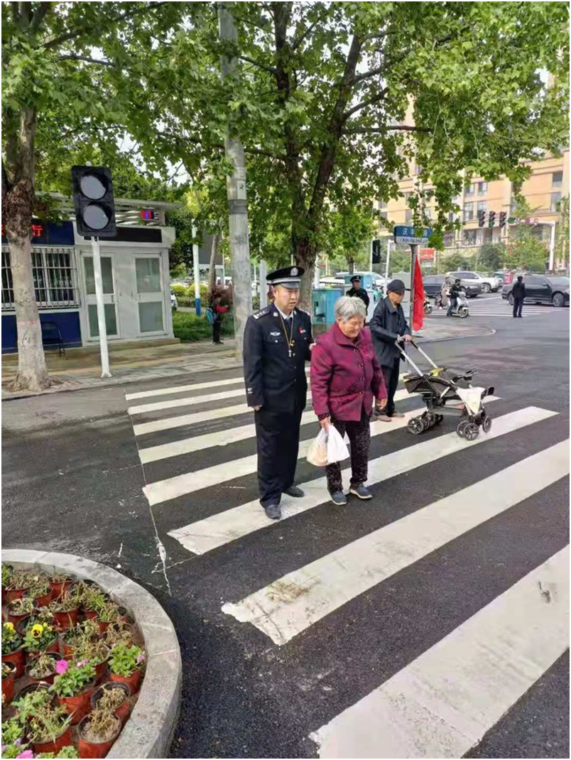 4月25日下午,細雨霏霏,示范區(qū)公安分局黨委委員、副局長劉峰和執(zhí)勤民警楊勇按照要求,在慶豐路和中原路交叉口紅綠燈處執(zhí)勤時,發(fā)現(xiàn)一位70多歲的老人步履蹣跚地往馬路對面走,由于步行速度較慢、紅綠燈時間短,她的步伐明顯有些不穩(wěn)。