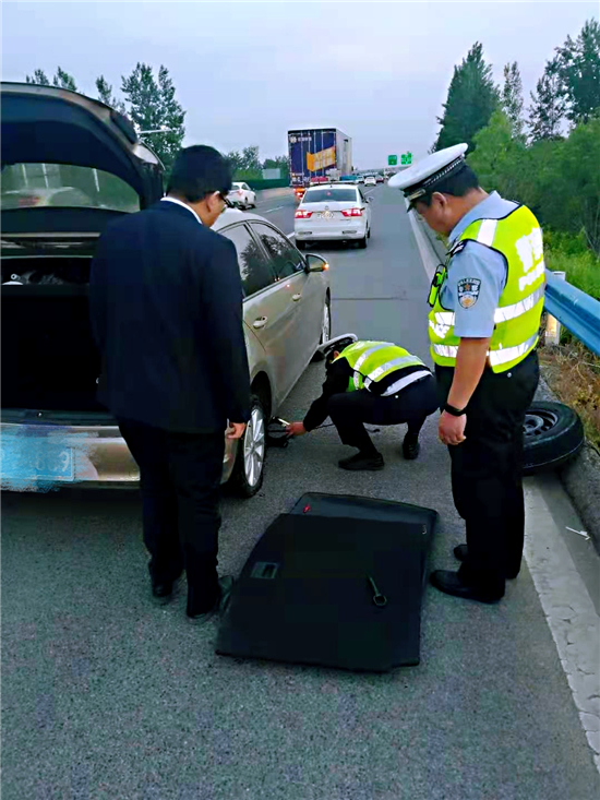 5月2日19時許,市公安局交通管理支隊高速二大隊項城中隊(以下簡稱高速二大隊項城中隊)民警由北往南方向巡邏途中,行駛到2081公里附近西半幅處,發(fā)現(xiàn)一輛轎車因車后輪爆胎,被迫停在應(yīng)急車道,民警隨即幫助該車主更換車載備胎,解決了司機(jī)的燃眉之急。