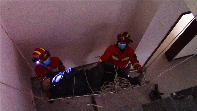 了解情況后,4名消防員立即深入地下室,利用擔架,先將老人保持原有姿勢轉(zhuǎn)移到擔架上,再用救援繩將老人綁在擔架上加以固定。最后,救援人員將擔架四角分別綁上救援繩,下方人員托扶擔架,上方人員將擔架平穩(wěn)的向上拉。經(jīng)過近30分鐘緊張救援,成功將被困老人救出,并交由醫(yī)護人員進行下一步處理。②10