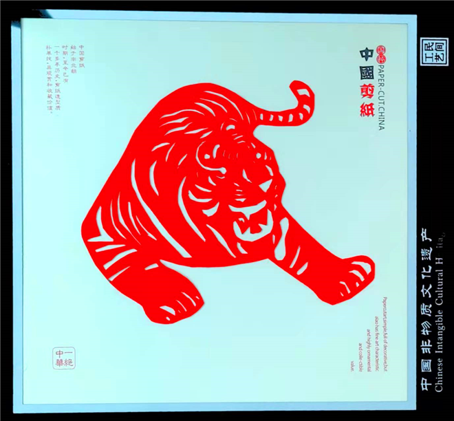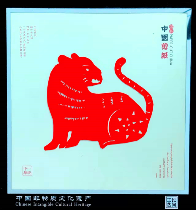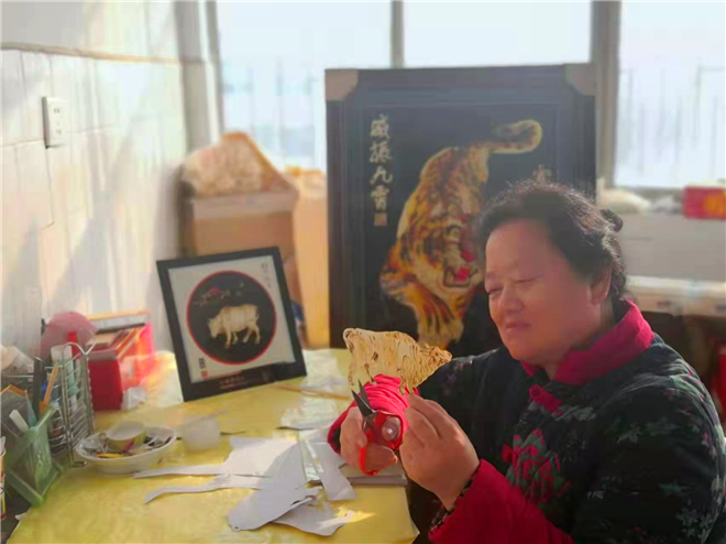為了慶?;⒛?,王春梅創(chuàng)作的秸稈畫主要有《威震九霄》《虎之王者》《飛天神虎》等,此外,她還創(chuàng)作了兩幅剪紙作品,分別是《虎年組圖》和《虎之2022》。和剪紙作品相比,秸稈畫制作工序更加復(fù)雜,全憑手工完成,充分利用秸稈本身的紋理和質(zhì)地,結(jié)合顏色、溫度的變化,將畫面立體的呈現(xiàn)出來。其中,她創(chuàng)作的部分作品結(jié)合了唐卡的相關(guān)風(fēng)格和顏色配比,比如《威震九霄》中虎的形象所表現(xiàn)出來的力量感借鑒了唐卡中護(hù)法的力量感;《虎之王者》和《虎之2022》中對(duì)于藍(lán)色的運(yùn)用結(jié)合了唐卡中的藍(lán)色,代表了永恒不變,如同穹蒼攬護(hù)萬物之意。