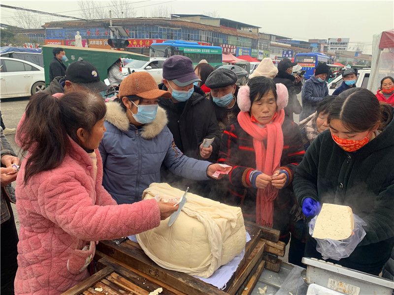 在固墻鎮(zhèn)的集市上,“桂枝熱豆腐”攤位前的顧客絡(luò)繹不絕?!敖o我來(lái)50塊錢的豆腐”“我要20斤,先給我切豆腐吧”“我要30斤,多少錢”……人群將豆腐攤里三層外三層圍了起來(lái),從人群外朝里看看不見(jiàn)豆腐,只看到豆腐攤里冒出來(lái)的團(tuán)團(tuán)熱氣?!暗攘税雮€(gè)小時(shí)了,剛才那一盒豆腐沒(méi)輪到我就賣完了,這才搶到手?!备浇拇迕駰畲鬆斈弥鴦傎I的豆腐高興地說(shuō)?!拔覐穆挂貋?lái)的,姐姐在里面擠著買豆腐,我在這兒等她呢?!?歲的張家瑞說(shuō),她每年放寒假都會(huì)和家人一起到固墻來(lái)探親,過(guò)年的時(shí)候逛逛集市,順便買些豆腐帶回鹿邑。
