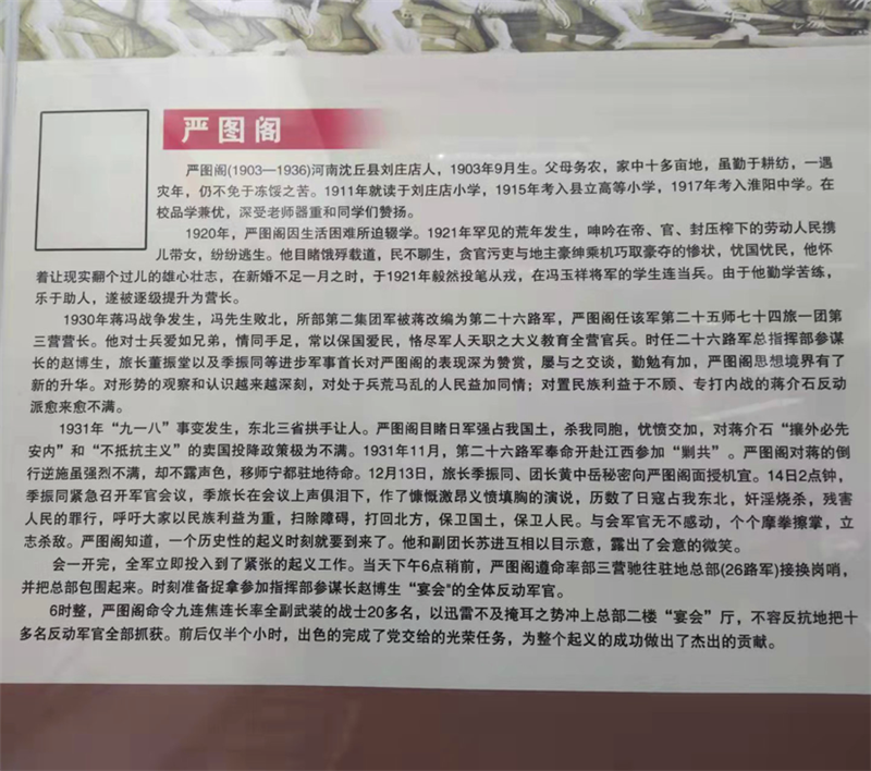 嚴(yán)圖閣出生于1903年,河南省沈丘縣人。1911年,嚴(yán)圖閣被父親送進(jìn)劉莊店小學(xué)讀書(shū),1915年考入縣立高等小學(xué),1917年投考淮陽(yáng)中學(xué)被錄取。他刻苦讀書(shū),成績(jī)優(yōu)異,深得老師和同學(xué)們的贊揚(yáng)。1921年,他毅然背井離鄉(xiāng),外出從軍。1930年,嚴(yán)圖閣任國(guó)民革命軍第二十六路軍一團(tuán)三營(yíng)營(yíng)長(zhǎng)。1931年12月,參加著名的寧都起義,成為中國(guó)共產(chǎn)黨領(lǐng)導(dǎo)的革命隊(duì)伍中的一員。寧都起義后,嚴(yán)圖閣所在部隊(duì)改編為紅軍第五軍團(tuán),由于其驍勇善戰(zhàn),累積戰(zhàn)功,被任命為第十六師參謀長(zhǎng)。1932年,嚴(yán)圖閣正式加入中國(guó)共產(chǎn)黨。1935年在湖北一場(chǎng)戰(zhàn)斗中身負(fù)重傷,后轉(zhuǎn)移至湖南省平江縣治療。1936年3月,嚴(yán)圖閣奉命擔(dān)任湘鄂贛省軍區(qū)司令員職務(wù),進(jìn)行游擊戰(zhàn)爭(zhēng),為保衛(wèi)湘鄂贛革命根據(jù)地作出了貢獻(xiàn)。1936年11月,嚴(yán)圖閣因病不幸去世。