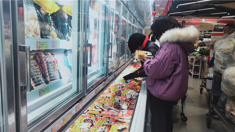2月15日是元宵節(jié),湯圓占據(jù)中心城區(qū)各大超市的熱銷(xiāo)C位,各式袋裝湯圓擺滿冰柜。