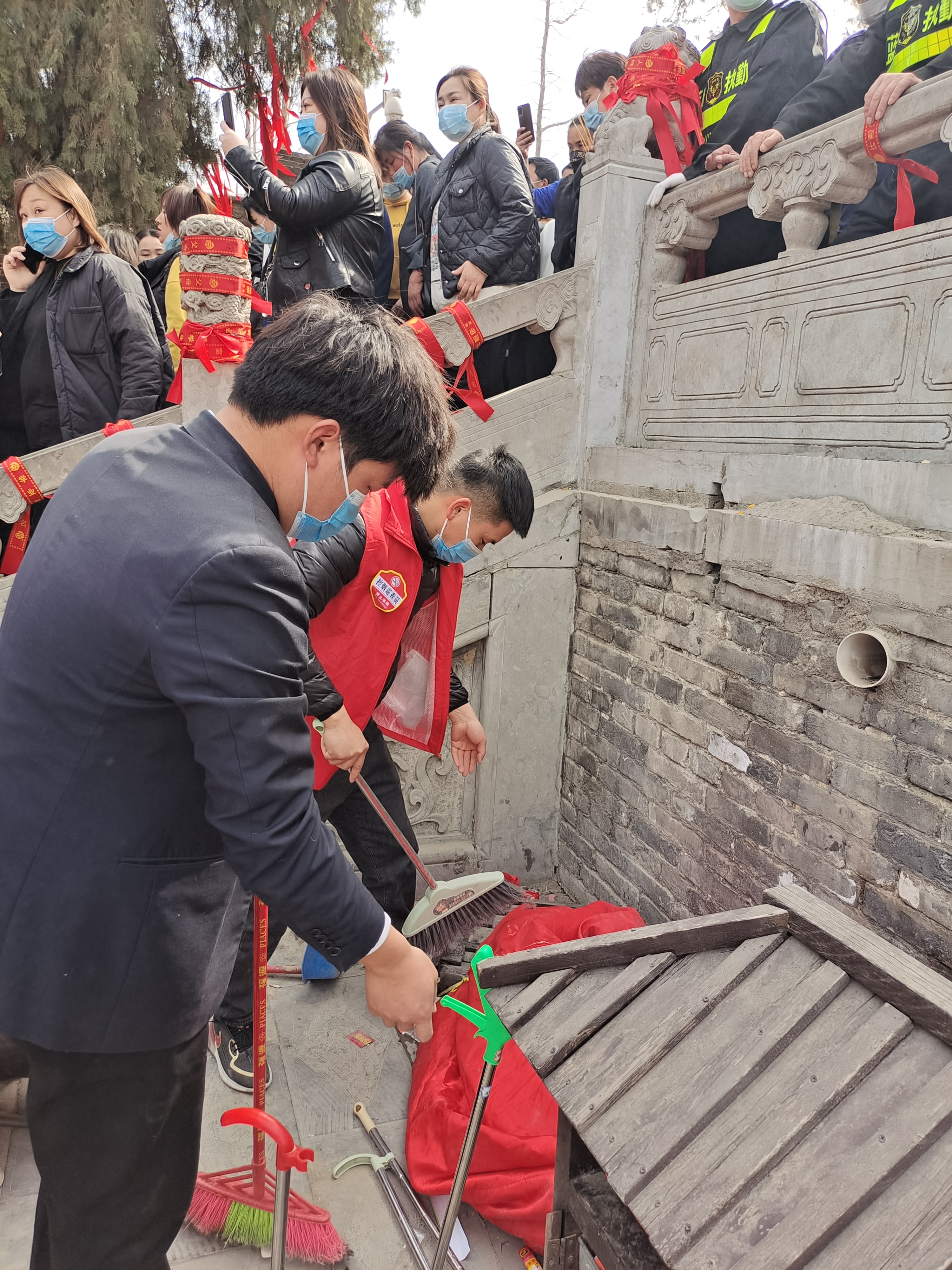 在伏羲陵墓后的蓍草園周圍,有人買紅布條系在欄桿上祈福,有人虔心祝禱。當蓍草成為聚焦點時,有人卻拿著打掃工具默默清理垃圾,讓蓍草園成為一方“凈土”。見他們身穿紅馬甲,記者上前詢問,原來是來自建業(yè)物業(yè)的志愿者,其中一名叫李小宇,他說太昊陵已經(jīng)成為淮陽門面,要做好衛(wèi)生,把太昊陵的良好形象維持住?!拔覀兌际亲栽盖皝?,讓家鄉(xiāng)父老不論啥時候都看到一個干干凈凈的太昊陵!”李小宇說。