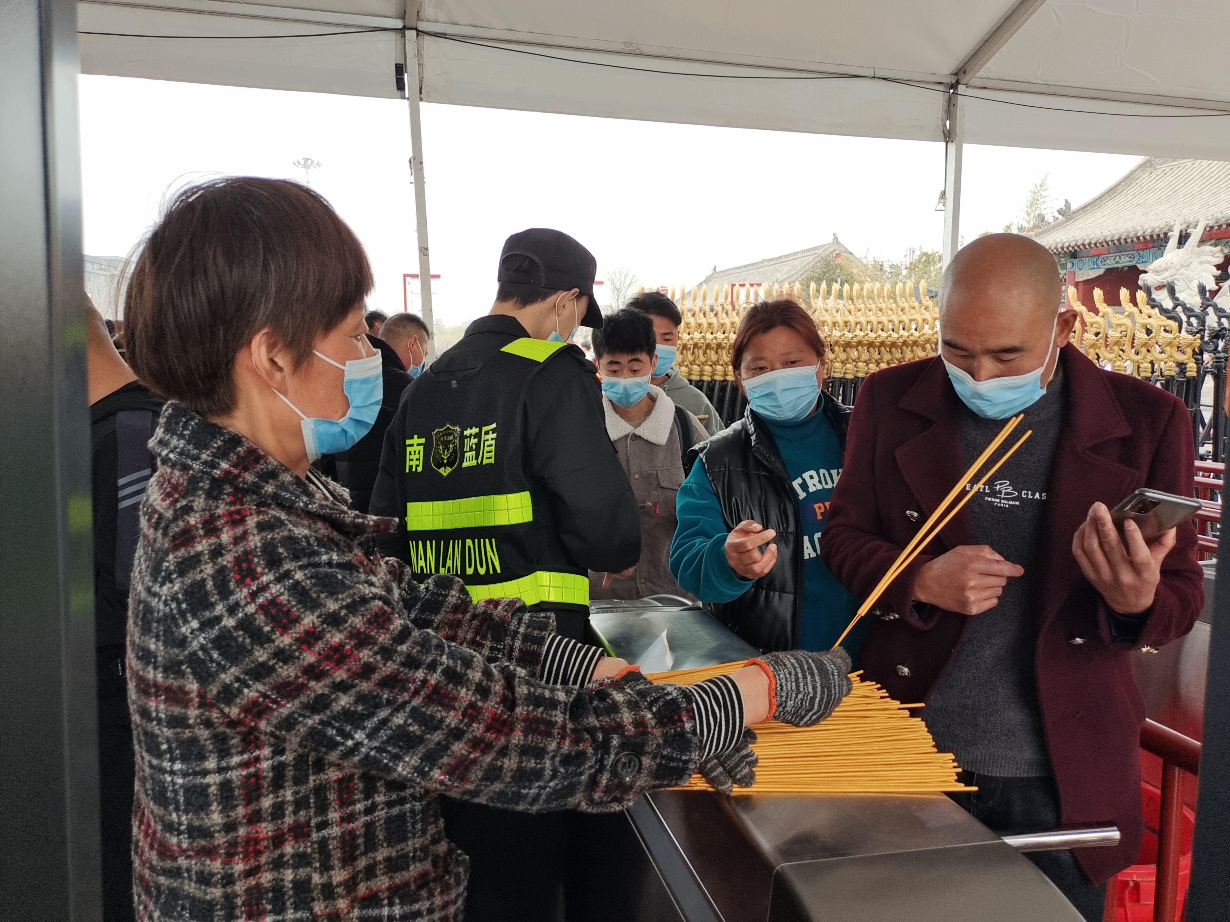 “這是您的祈福香,請拿好?!碧涣甑拿總€入口,既有專人檢查私自帶香行為,也有工作人員為游客免費發(fā)放線香。家住淮陽區(qū)的李姐是其中一員,她早上5時30分就到達景區(qū),領(lǐng)取線香并整理,方便為游客發(fā)放?!爸灰€有游客來,我們就不休息,要把祈福的心愿送到他們手中,并引導他們文明燒香、文明祭祀。”李姐說。