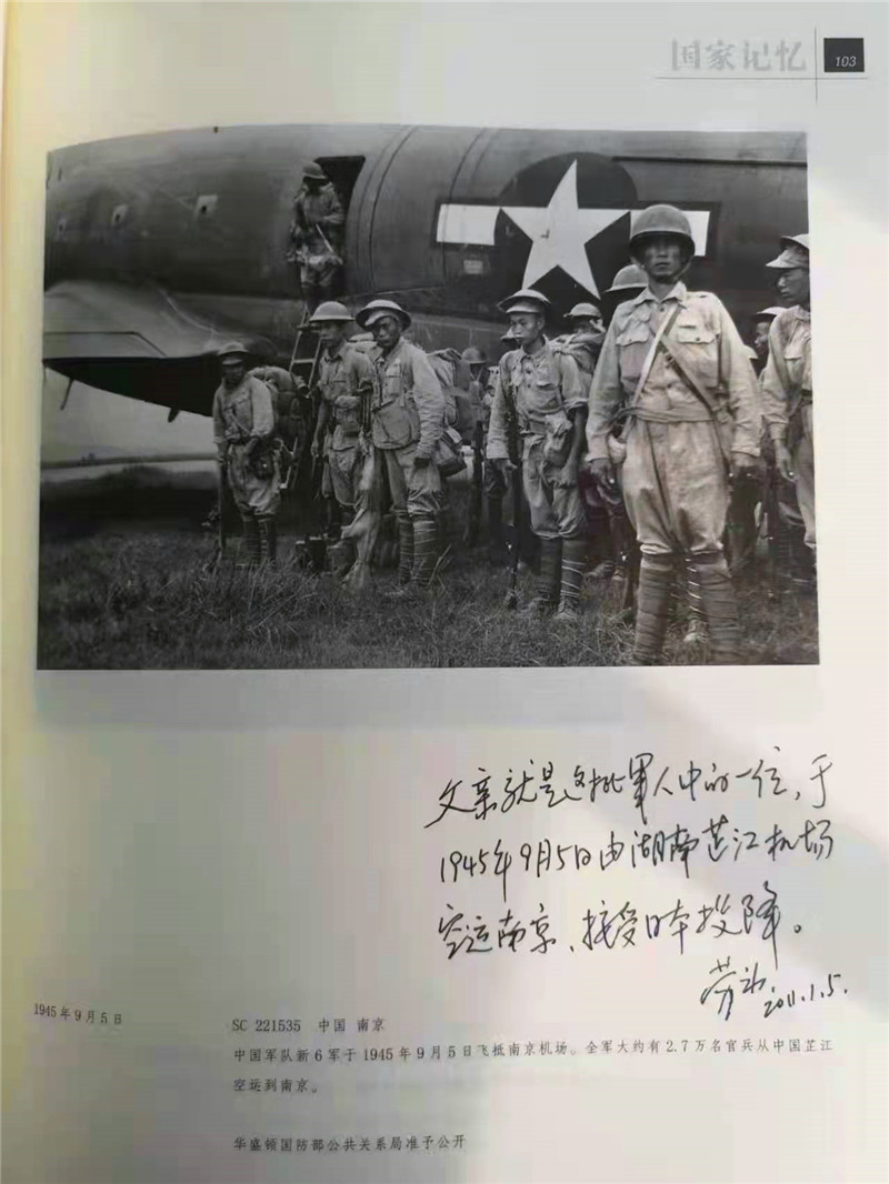 1945年3月,父親隨干訓(xùn)團空運回國,駐扎云南曲靖,繼續(xù)訓(xùn)練、待命。1945年8月15日,日本投降。干訓(xùn)團全體官兵乘汽車到達湖南芷江機場(插圖5),再空運到南京,參加南京日本受降儀式(插圖6) 。