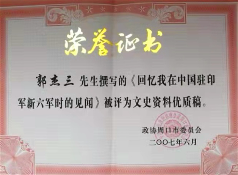 2005年9月3日,時任中共中央總書記、國家主席、中央軍委主席胡錦濤發(fā)表了《在紀念中國人民抗日戰(zhàn)爭暨世界反法西斯戰(zhàn)爭勝利60周年大會上的講話》,正視了正面戰(zhàn)場國民黨軍隊抗戰(zhàn)的歷史。之后,父親才給我講述他遠征抗日的經(jīng)歷,并撰寫了《回憶我在中國駐印軍新六軍時的見聞》一稿,刊登在2007年《周口文史資料》上。政協(xié)為表彰父親的貢獻,特別頒發(fā)了“文史資料優(yōu)質(zhì)稿”獎狀。