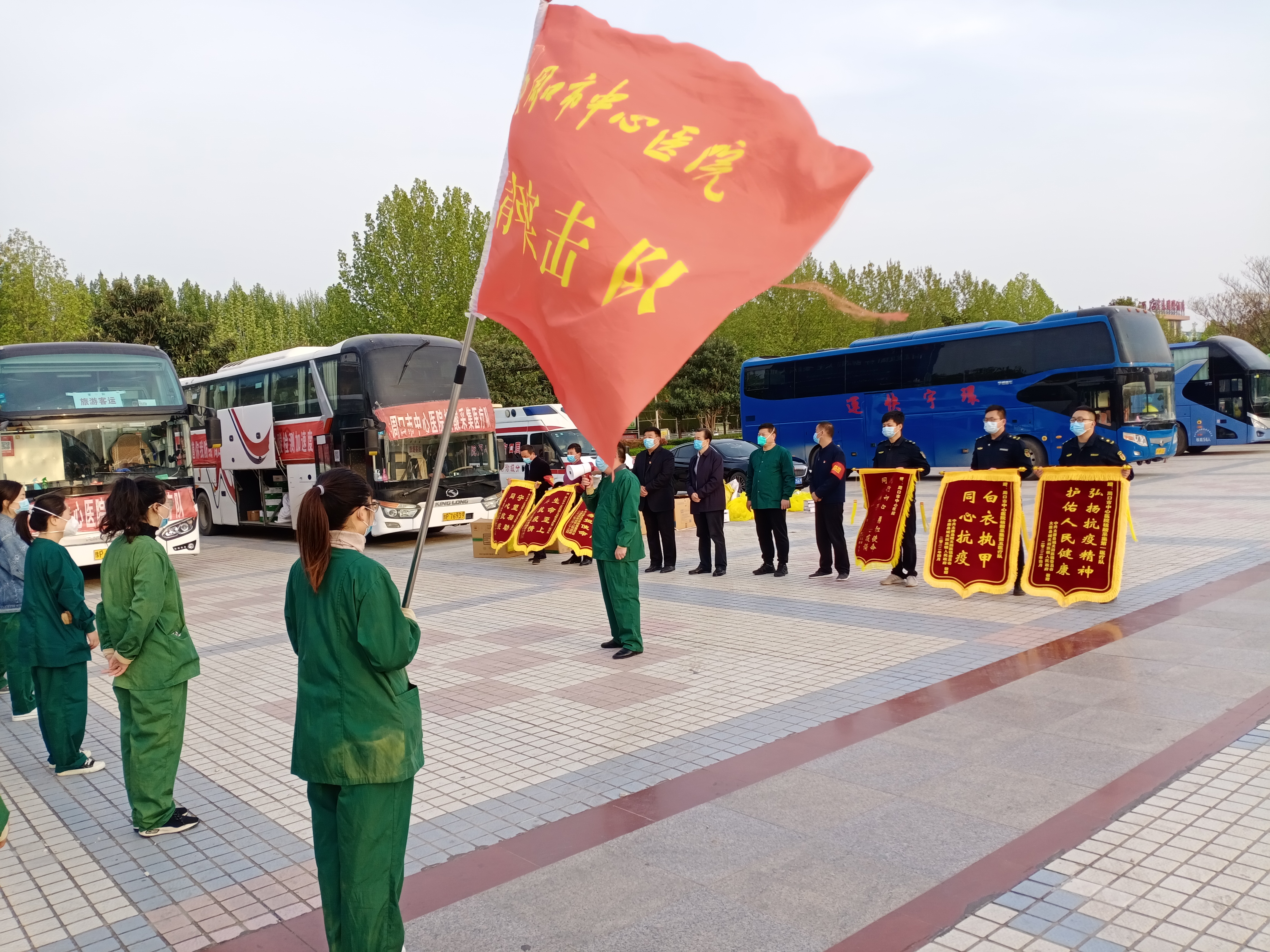日前,太康縣城關(guān)鎮(zhèn)、符草樓鎮(zhèn)相關(guān)負(fù)責(zé)人將寫有“白衣執(zhí)甲 同心抗疫”“弘揚(yáng)抗疫精神 護(hù)佑人民健康”“守望相助 同心抗疫”字樣的錦旗送到前來支援太康縣的周口市中心醫(yī)院醫(yī)務(wù)人員手中,感謝他們的無私幫助。③6 記者 張洪濤 攝