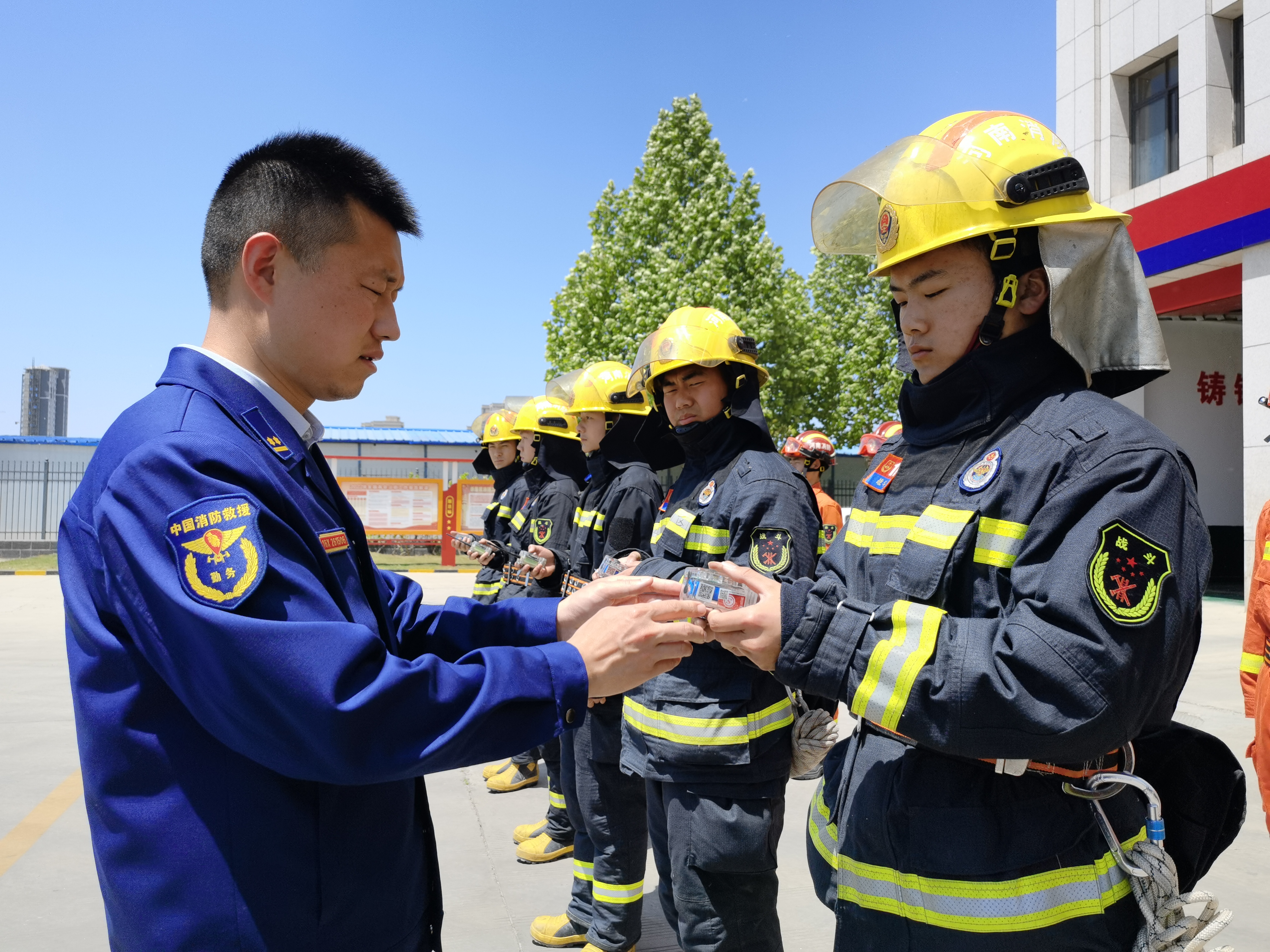 全封閉管理、備戰(zhàn)狀態(tài),檢查裝備、養(yǎng)護(hù)車輛,給消防救援人員上課……5月4日,示范區(qū)消防救援站指導(dǎo)員欒慶帥站在烈日下為消防救援隊(duì)員講授專業(yè)救援技巧和專業(yè)工具使用方法。