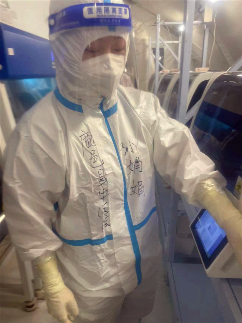 3月18日,孫娟娟及同事進(jìn)駐了長春疫情最嚴(yán)重的九臺(tái)區(qū),隨行的還有方艙實(shí)驗(yàn)室。次日,孫娟娟和同事們進(jìn)行了防護(hù)培訓(xùn),隨即開始核酸檢測實(shí)驗(yàn)。孫娟娟穿著密不透風(fēng)的防護(hù)服,身心各種莫名的滋味都涌上來了。當(dāng)她想到這每一個(gè)標(biāo)本后面是一雙雙期盼的眼睛、一個(gè)個(gè)焦慮的家庭,她不禁為自己打氣——加油!我們就是這場疫情的偵察兵,要把偵察到的情報(bào)準(zhǔn)確無誤地傳遞過去。