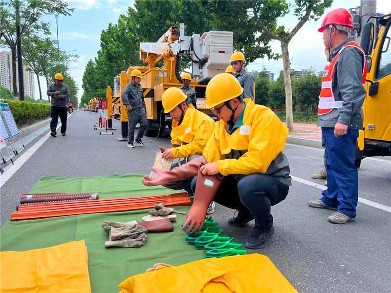 當(dāng)日下午,在中心城區(qū)武盛大道南段,國網(wǎng)周口供電公司工作人員嚴(yán)格按照標(biāo)準(zhǔn)化作業(yè)流程,穿戴絕緣服、絕緣安全帽、絕緣手套等防護(hù)安全工器具,在黃色絕緣斗臂車“長臂”的助力下于高空中有序進(jìn)行施工。