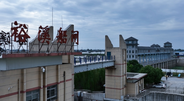 9月24日,豫貨出海、“周”向世界——周口航運(yùn)出海大型異地采訪活動(dòng)采訪組B組沿江淮運(yùn)河南下,一路上攬渡槽、臨派河、經(jīng)巢湖閘,再沿裕溪河左岸大堤下行,經(jīng)過一道河灣后,一座高大的建筑如臥龍一般橫跨裕溪河上。