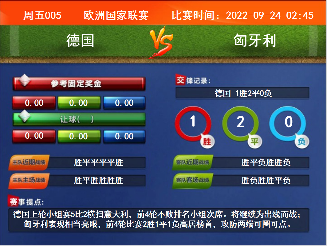 比賽時間:2022-09-24 02:45賽事提點:德國上輪小組賽5比2橫掃意大利,前4輪不敗排名小組次席。將繼續(xù)為出線而戰(zhàn);匈牙利表現(xiàn)相當亮眼,前4輪比賽2勝1平1負高居榜首,攻防兩端可圈可點。
