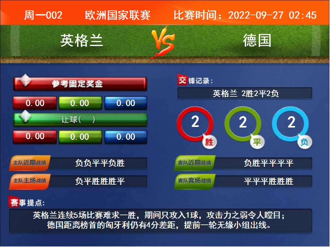 比賽時間:2022-09-27 02:45賽事提點:英格蘭連續(xù)5場比賽難求一勝,期間只攻入1球,攻擊力之弱令人瞠目;德國距離榜首的匈牙利仍有4分差距,提前一輪無緣小組出線。