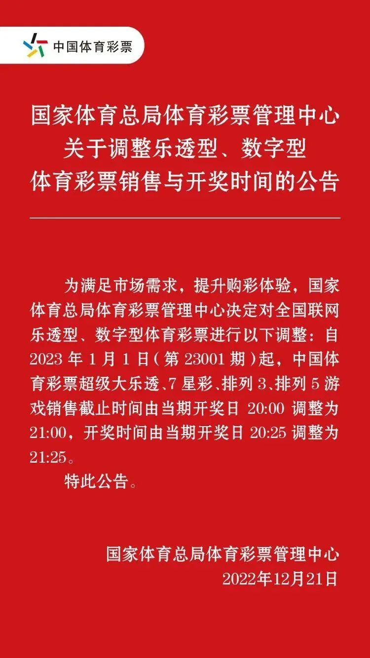 2023年1月1日(第23001期)起,體彩超級大樂透、7星彩、排列3、排列5游戲的銷售截止時間將延后至每晚21:00,開獎時間將延后至不同游戲相應開獎日當晚21:25。體彩上述四款游戲止售、開獎延后一小時,將為購彩者帶來更加便利的購彩體驗。