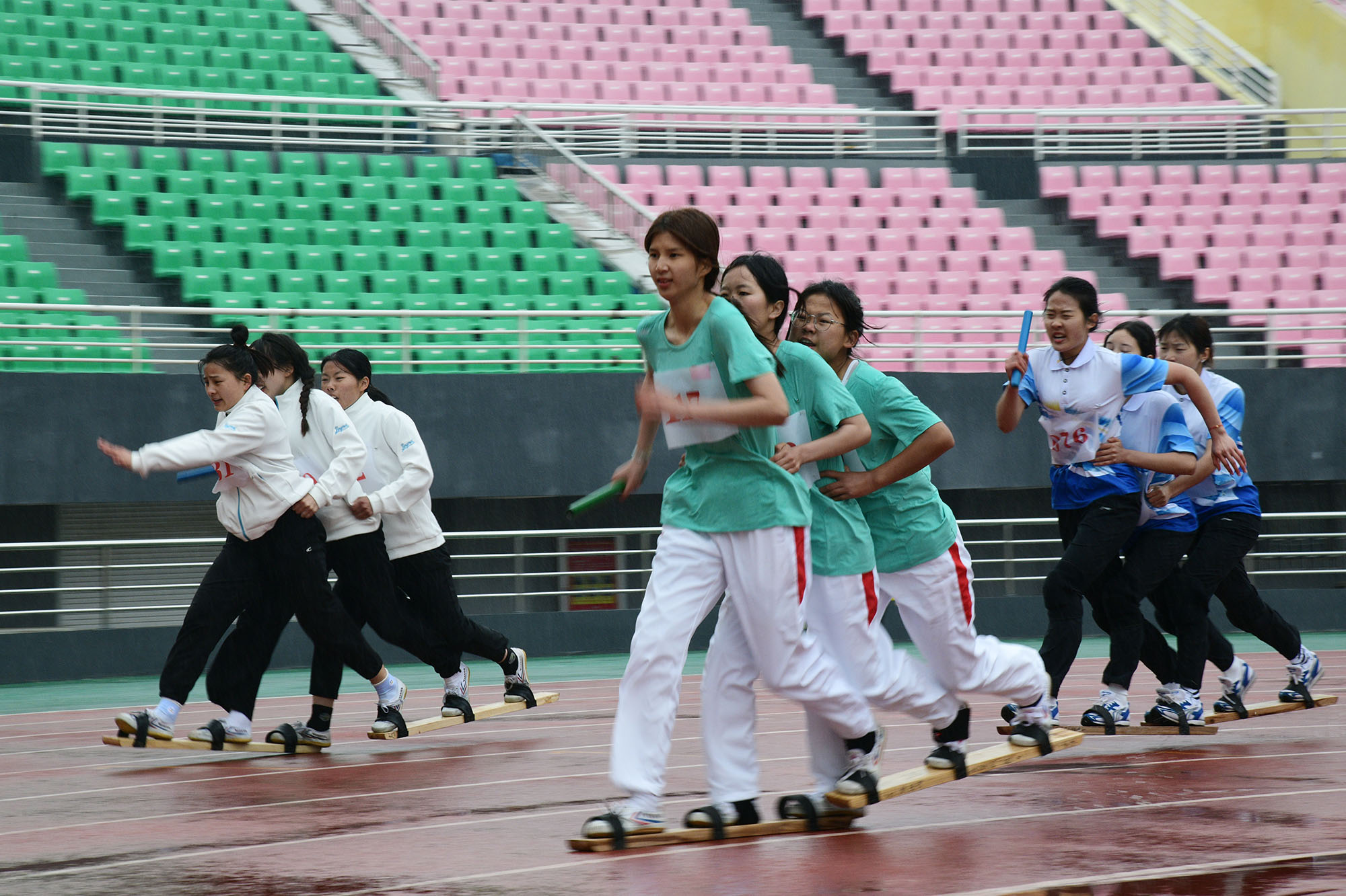 三人共穿一雙板鞋,板鞋競(jìng)速項(xiàng)目考驗(yàn)著運(yùn)動(dòng)員的默契度,需要達(dá)到“三人合一、人板合一”的程度。在雨天,板鞋與賽道、腳底與板鞋之間都容易打滑,一定程度上制約著運(yùn)動(dòng)員的發(fā)揮。
