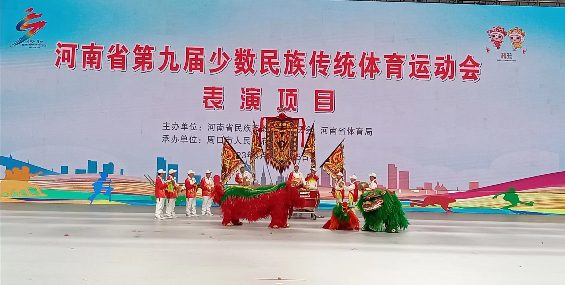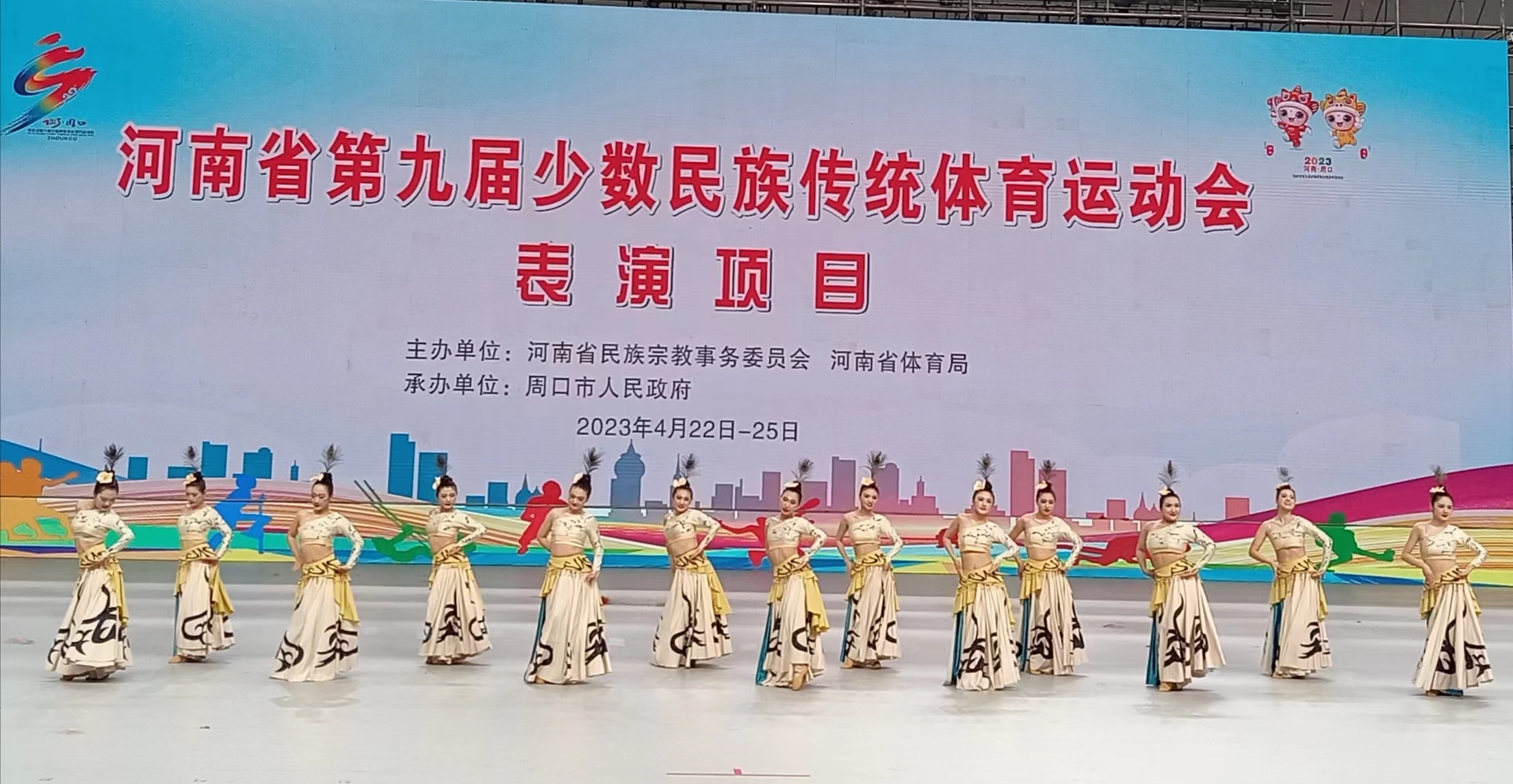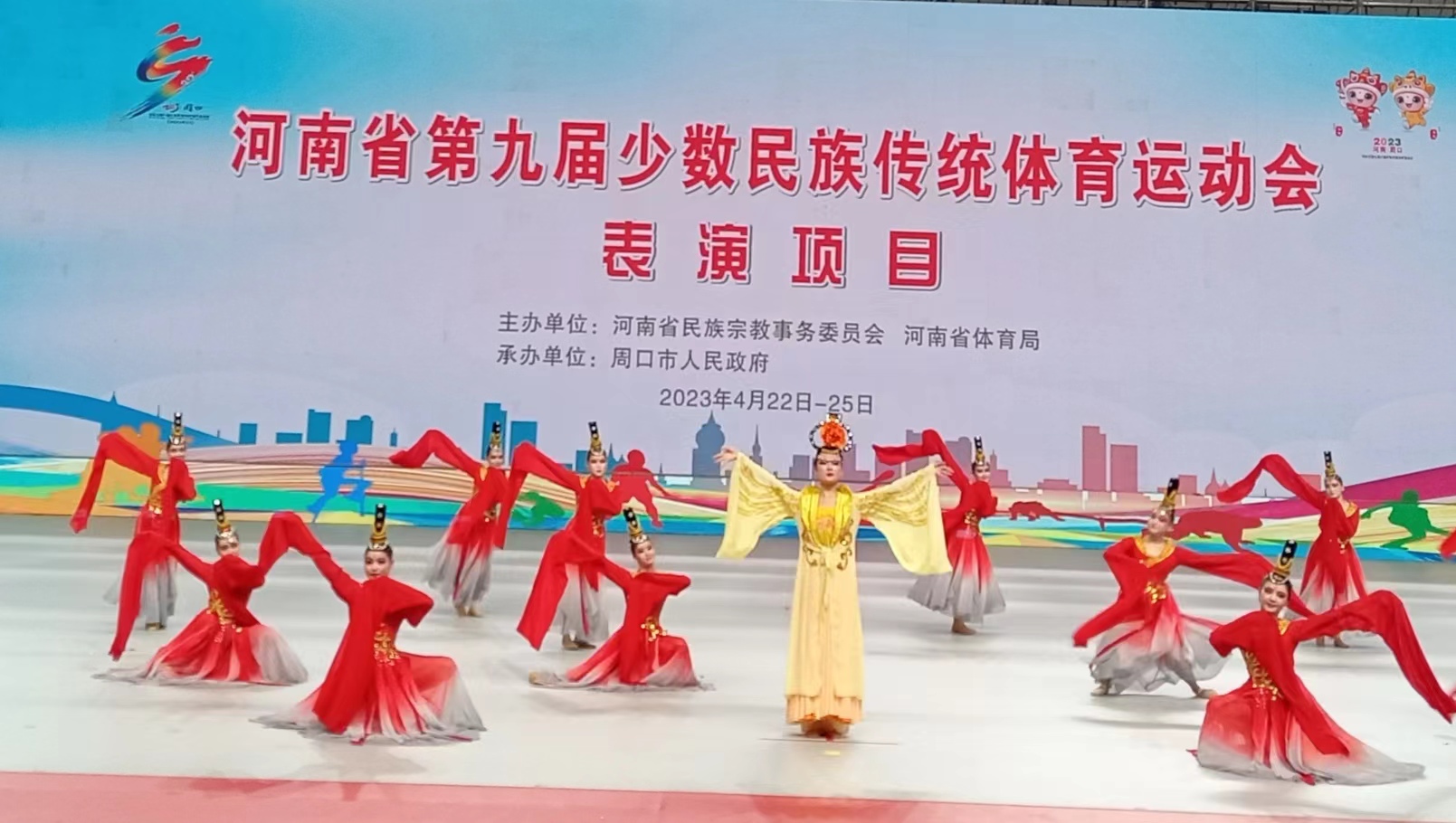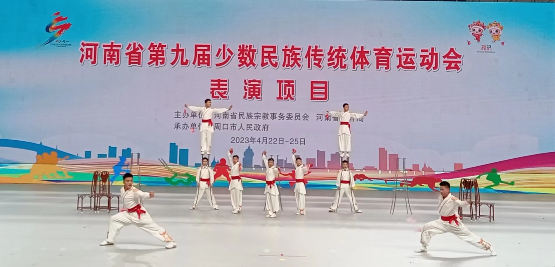 4月25日上午,在周口市體育館舉行的頒獎儀式上,頒獎嘉賓公布,平頂山市代表隊的《龍舞呈祥》、鄭州市代表隊的《盛世展宏圖》、開封市代表隊的《追夢少年》3個表演項目獲得第九屆全省民族運動會表演項目技巧類一等獎。