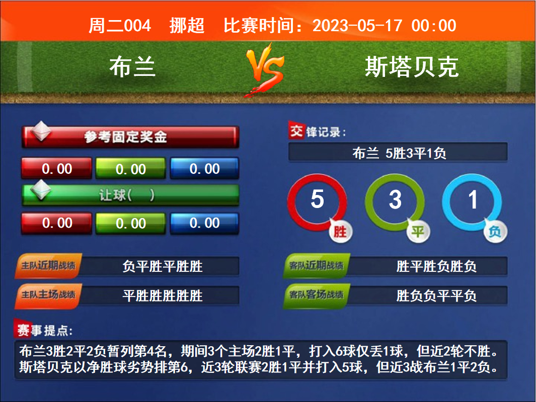 比賽時間:2023-05-17 00:00賽事提點:布蘭3勝2平2負暫列第4名,期間3個主場2勝1平,打入6球僅丟1球,但近2輪不勝。斯塔貝克以凈勝球劣勢排第6,近3輪聯(lián)賽2勝1平并打入5球,但近3戰(zhàn)布蘭1平2負。