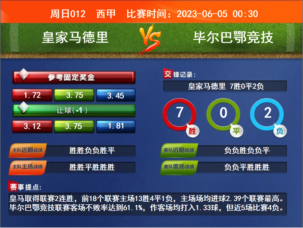 比賽時(shí)間:2023-06-05 00:30賽事提點(diǎn):皇馬取得聯(lián)賽2連勝,前18個(gè)聯(lián)賽主場13勝4平1負(fù),主場場均進(jìn)球2.39個(gè)聯(lián)賽最高。畢爾巴鄂競技聯(lián)賽客場不敗率達(dá)到61.1%,作客場均打入1.33球,但近5場比賽4負(fù)。