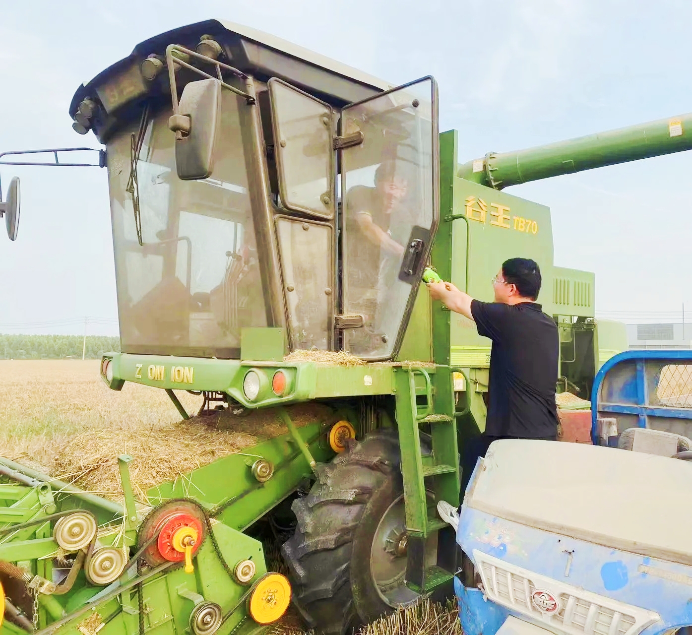 6月2日下午3時(shí)許,天空已經(jīng)陰沉下來,不時(shí)有零星小雨滴落。許灣辦事處石莊行政村村民肖士禮站在自家的地頭上,注視著收割機(jī)來來往往,機(jī)器發(fā)出隆隆的轟鳴聲,格外響亮。收割機(jī)駛過,“麥浪”逐漸消失,伴隨著收割機(jī)尾部吐出的碎末,秸稈鋪成一條條小路。滿倉后,麥粒從收割機(jī)里跳躍而出,堆起一座座小山?!笆掷镉屑Z心里不慌。順利收了,我這心也不吊著了?!毙な慷Y眉頭緊皺,旁邊陪伴著他的村干部和駐村第一書記石彥龍?jiān)谝慌暂p聲安慰。
