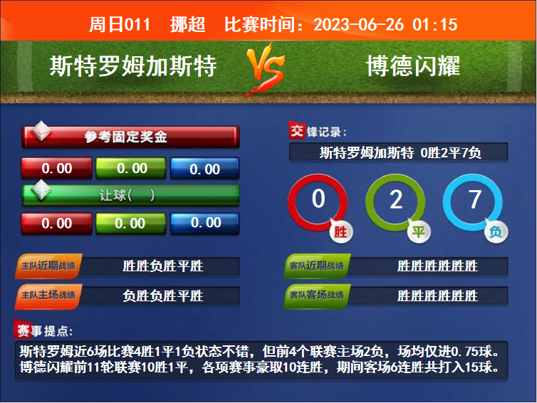 比賽時間:2023-06-26 01:15賽事提點:斯特羅姆近6場比賽4勝1平1負(fù)狀態(tài)不錯,但前4個聯(lián)賽主場2負(fù),場均僅進(jìn)0.75球。博德閃耀前11輪聯(lián)賽10勝1平,各項賽事豪取10連勝,期間客場6連勝共打入15球。