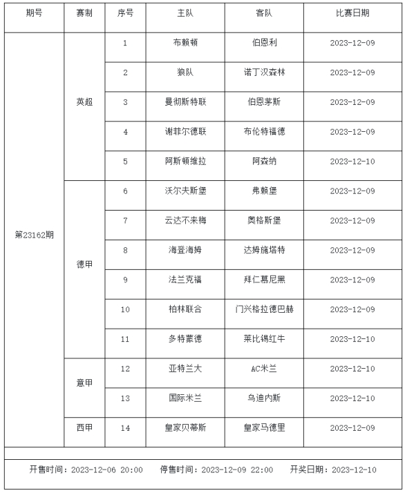 足球彩票勝負(fù)游戲(14場和任選9場)第23162期賽程: