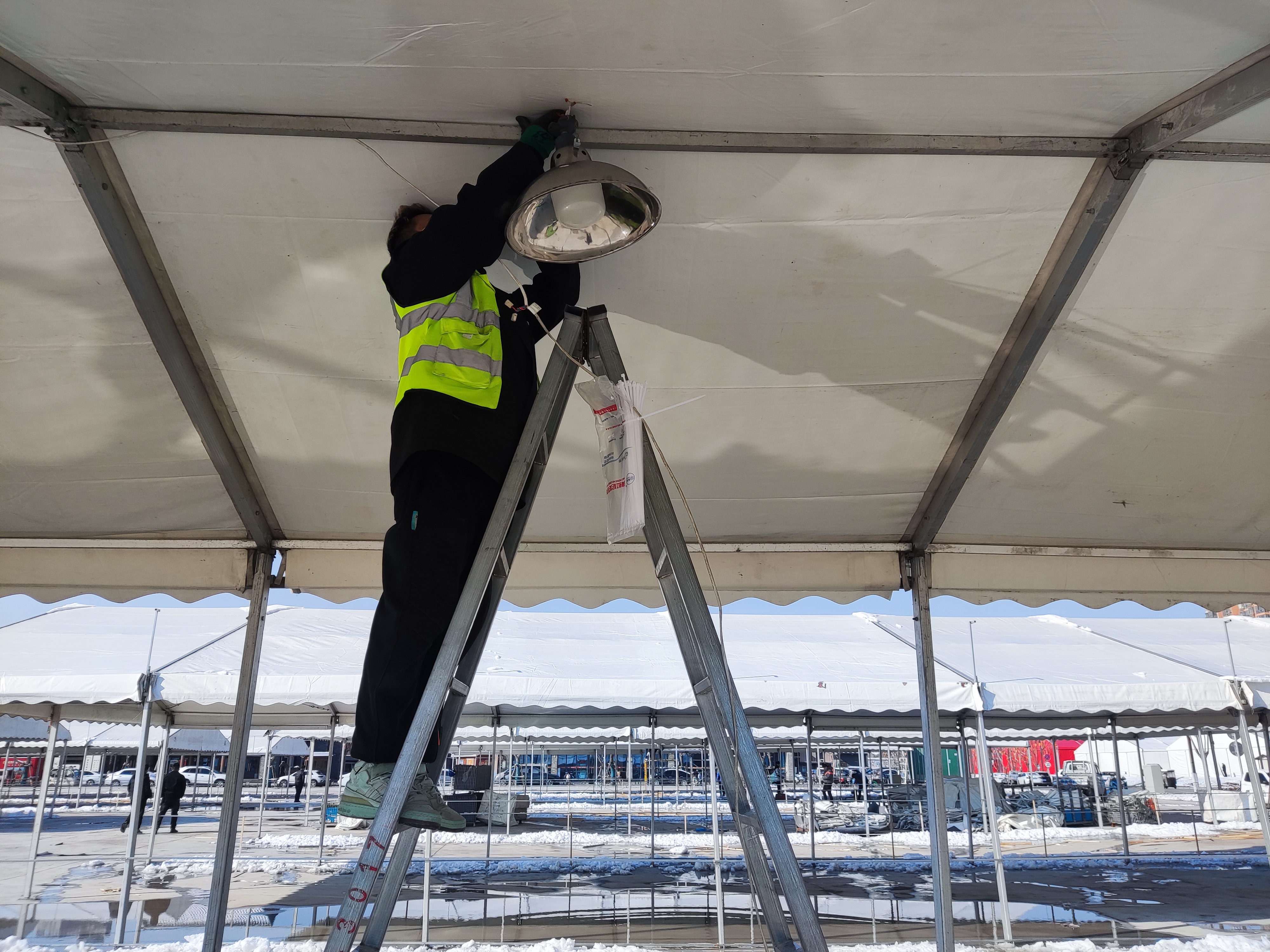 1月23日記者在現(xiàn)場(chǎng)看到,展區(qū)大篷內(nèi),工人正在做水電安裝、焊接等掃尾工作。