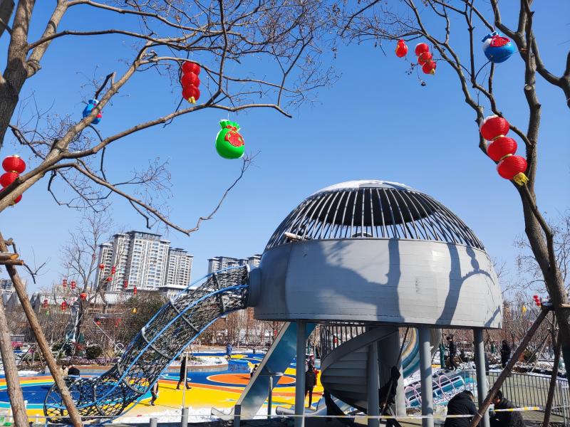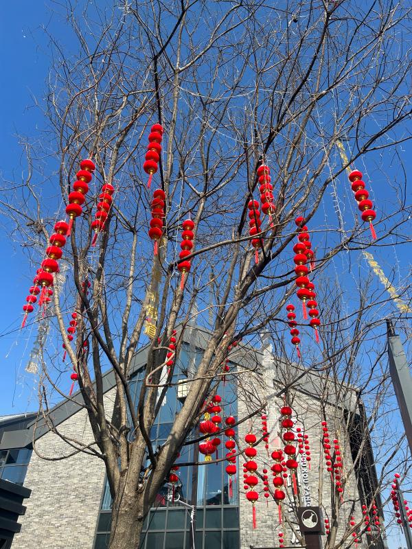 1月23日,記者在施工現(xiàn)場看到,施工人員正緊鑼密鼓進(jìn)行最后的掃尾工作。道路兩旁樹枝上掛滿了象征吉祥如意的紅燈籠、中國結(jié)、春字燈飾。