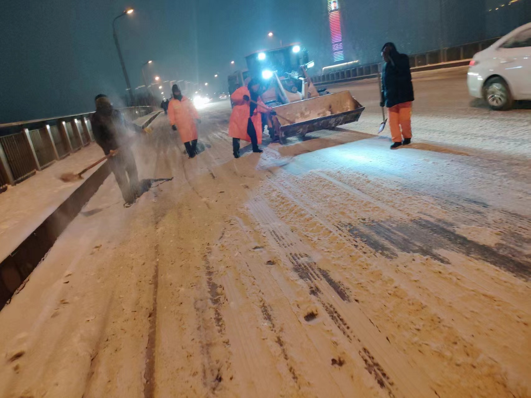 2月2日下午,為降低夜間低溫可能造成的路面結冰影響,市城管局組織人員加強對城區(qū)主要道路、橋梁等重點區(qū)域巡查,及時了解收集易結冰路段情況,各區(qū)城管組織人員車輛分班作業(yè),采取人車齊上陣,晝夜不停清理道路積雪。同時組織人工保潔力量,分布在城區(qū)各條道路上,分工協(xié)作,有條不紊,撒布融雪劑,為群眾出行安全保駕護航。