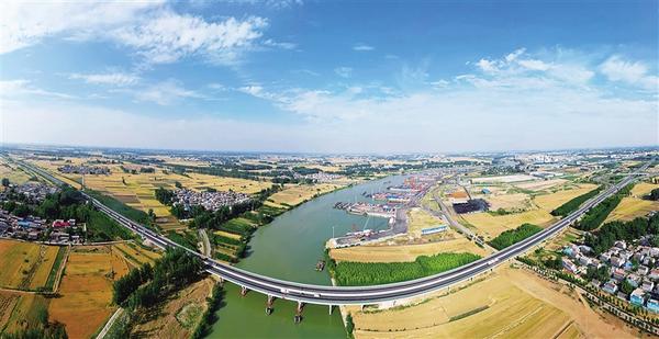 5月27日,周口港中心港區(qū)在碧水、藍天、白云、金色麥浪、秀美村莊的映襯下,顯得十分壯美。近年來,我市利用水陸交通優(yōu)勢,加快構(gòu)建“鐵公機水”多式聯(lián)運體系,努力從“經(jīng)濟通道”邁向“通道經(jīng)濟”。