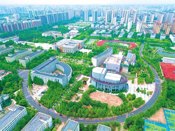 六月二十四日上午,鳥瞰周口師范學(xué)院校區(qū),曲折小道環(huán)抱音樂廳、大禮堂、圖書館等建筑,宛若一把巨大的琵琶,在中心城區(qū)奏響文明發(fā)展進行曲。