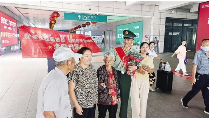 9月4日,在高鐵周口東站出站口,市民們早早守候,手拉橫幅,眼里閃著期待的淚光,迎接從部隊退役的親人。橫幅上的每一個字,都是家人最深沉的愛與最由衷的敬佩:“昔日從戎報國志,今朝卸甲創(chuàng)輝煌。”