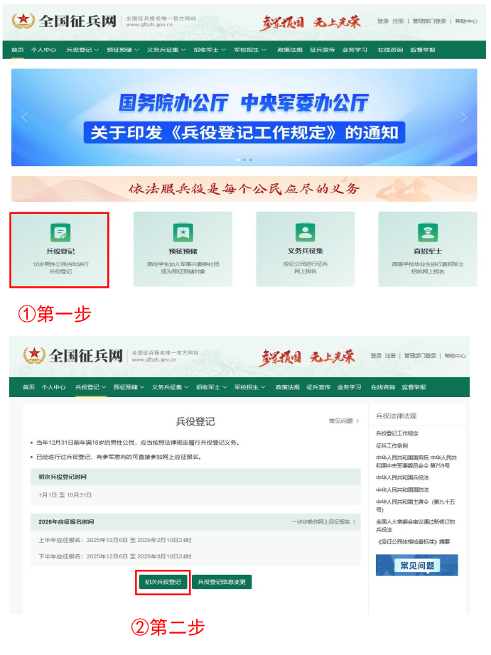 《中華人民共和國(guó)兵役法》規(guī)定,“國(guó)家實(shí)行兵役登記制度。兵役登記包括初次兵役登記和預(yù)備役登記。每年十二月三十一日以前年滿(mǎn)十八周歲的男性公民,都應(yīng)當(dāng)按照兵役機(jī)關(guān)的安排在當(dāng)年進(jìn)行初次兵役登記”。參加兵役登記是法律賦予每個(gè)適齡男性公民應(yīng)盡的光榮義務(wù)和神圣責(zé)任,應(yīng)自覺(jué)按時(shí)進(jìn)行登記或核對(duì)。