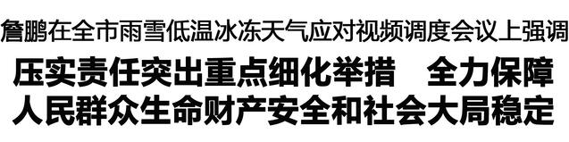 本報訊 (記者 李鳳霞) 1月18日,市長詹鵬主持召開全市雨雪低溫冰凍天氣應對視頻調度會議,強調要深入學習貫徹習近平總書記關于防災減災救災的重要指示精神,貫徹落實省委和市委決策部署,以“時時放心不下”的責任感,扎實有效應對雨雪低溫冰凍天氣,確保人民群眾生命財產(chǎn)安全和社會大局和諧穩(wěn)定。孔陽、朱向陽、張建黨、程若光、王文峰出席會議。