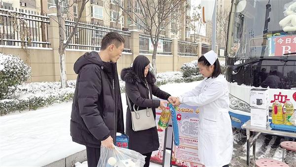 1月19日,熱心市民冒雪步行到獻血車無償獻血,以熱血守護生命。圖為市民獻血后領取無償獻血紀念品。
