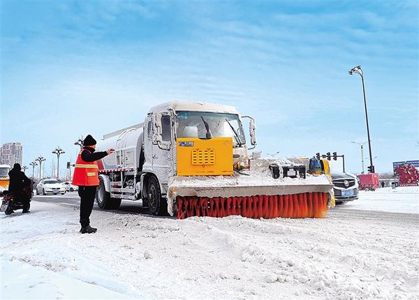 1月19日,環(huán)衛(wèi)工在關(guān)帝廟廣場清掃積雪,保障道路暢通。