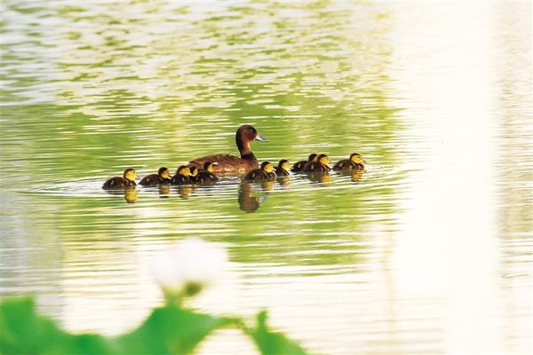 6月24日,世界極度瀕危物種、國家一級(jí)保護(hù)野生動(dòng)物青頭潛鴨現(xiàn)身淮陽龍湖。當(dāng)日,一只青頭潛鴨帶著10只可愛的“鴨寶寶”在湖中緩緩游弋。有關(guān)方面人士告訴記者,種種跡象可以證明:青頭潛鴨已在淮陽龍湖國家濕地公園安家落戶、繁衍生息。